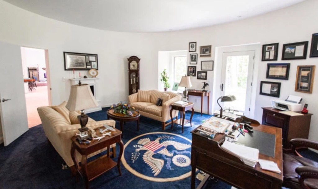 According to Realtor.com, owners Katie and Greg Knowles purchased the home in 2009 and customized it for 18 months. Greg is a music producer, so that explains the studio. Katie wanted the pool available year-round, so that’s why it’s indoors and heated. As for the Oval Office replica, she said the architect suggested the office design and the couple just went for it.