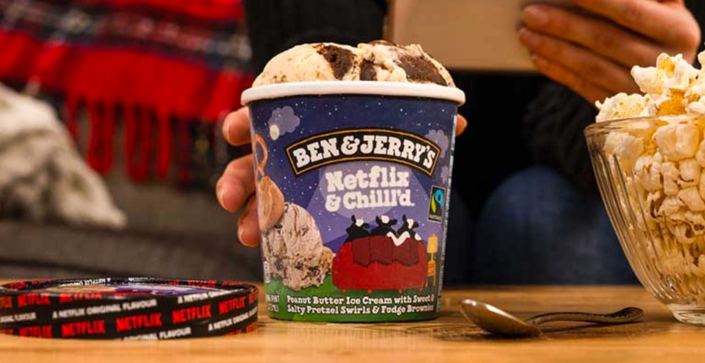 Ice cream maker Ben & Jerry’s teamed up with Netflix to churn up a sweet and savory creation, and they named it “Netflix & Chilll’d.”