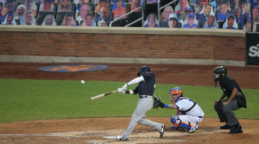 Yankees outfielder Clint Frazier, one of a handful of Major Leaguers planning to wear a face mask throughout the season, cracked a two-run homer in the 4th inning off Mets pitcher Rick Porcello.