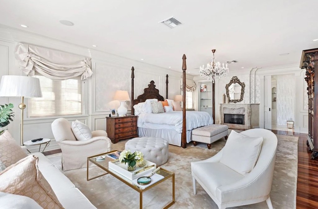 Inside, a crystal chandelier dangles from 26-foot domed ceilings over a Cinderella staircase. The foyer leads to entertaining areas, a screening room, a wood-paneled office, a gym and a primary bedroom suite with two full bathrooms.