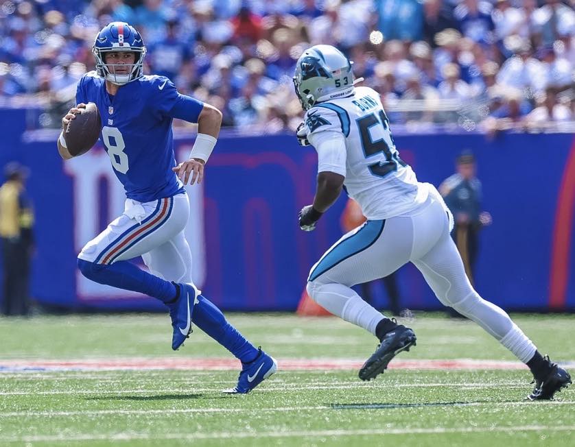 Carolina (0-2) had a chance to tie or go ahead, but a blitzing Julian Love sacked Carolina quarterback Baker Mayfield on third-and-5 to force a punt with 2:06 to play. The Giants were able to run out the clock, keyed by an 11-yard run by quarterback Daniel Jones on a third-and-2 that sealed the victory.
