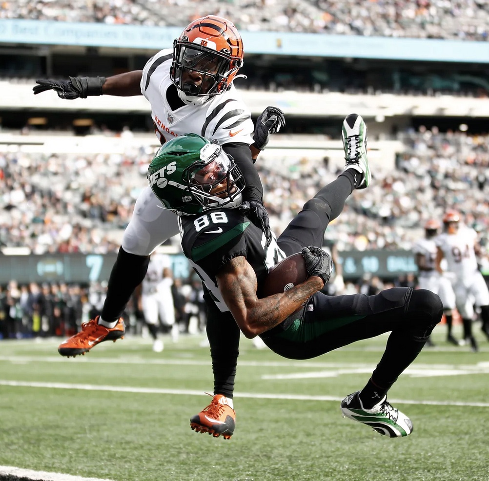 In the first half it was all Bengals. The Jets pass rush put little pressure on Bengals quarterback Joe Burrow. With time to throw Burrow picked the Jets secondary apart, repeatedly hitting on deep passes to his star trio of wide receivers.