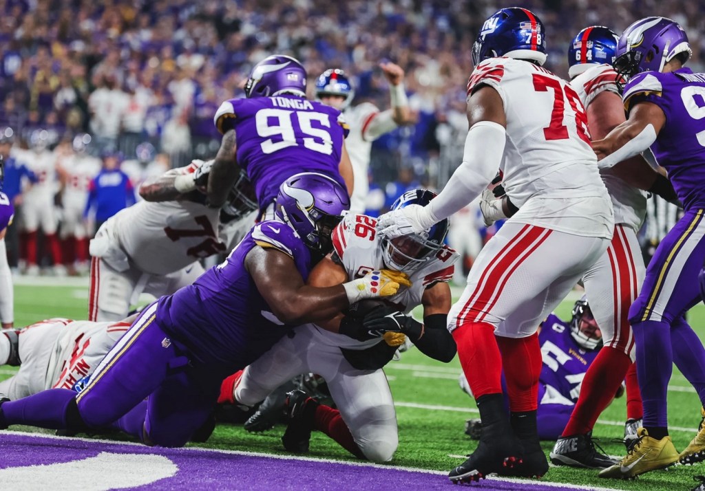 The Giants got a 2-yard touchdown run by Saquon Barkley to take a 31-24 lead with 7:47 to play. They sealed the victory when Xavier McKinney tackled Minnesota’s T.J. Hockenson short of the first down on a desperation fourth-and-8 with 1:44 to play and the Vikings out of timeouts.