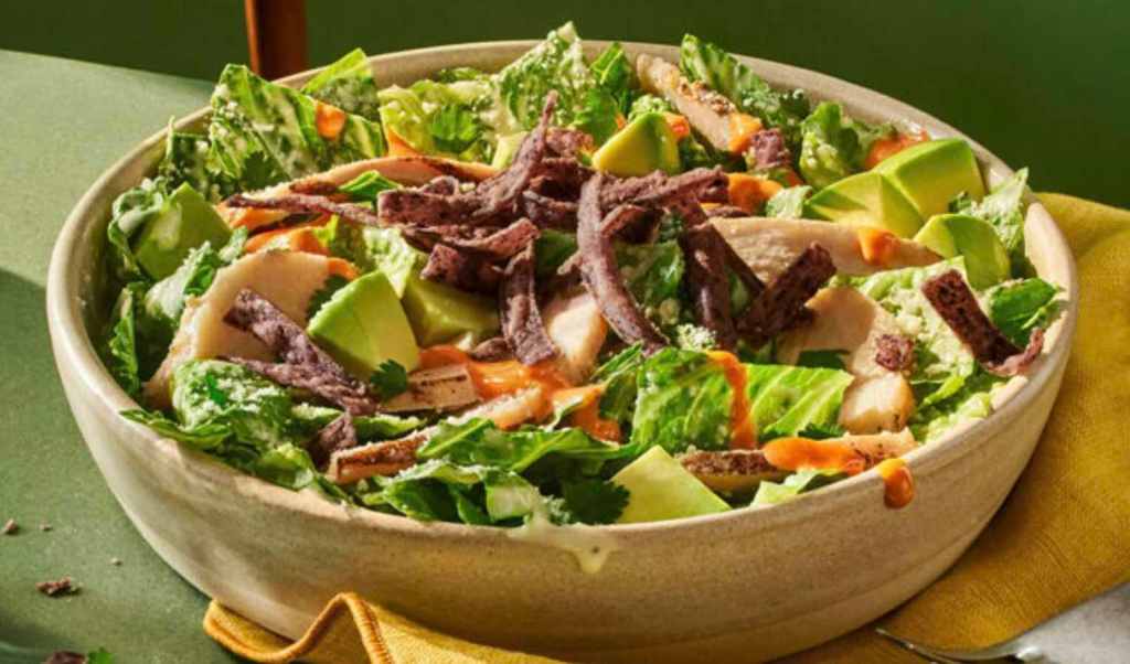 The new Southwest Caesar Salad with Chicken features crisp romaine tossed in Caesar dressing, with a drizzle of chipotle aioli and the crunch of blue corn tortilla strips. Raised without antibiotics grilled chicken breast, chunks of fresh avocado, grated parmesan cheese, and cilantro top off the new dish.