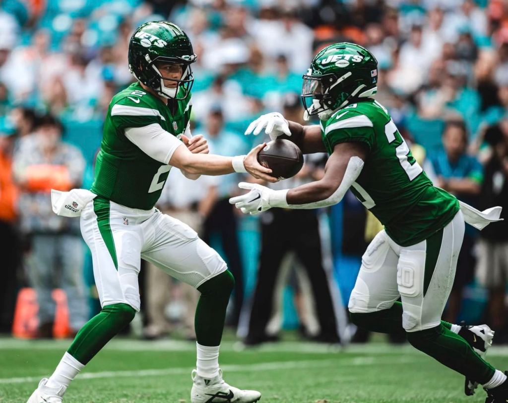 Quarterback Zach Wilson was under siege in the first half behind an offensive line that played an atrocious game. He exited the game just before halftime with a head injury. Wilson had no chance to duplicate his performance against the Texans last week as he was under pressure every time he dropped back and was sacked four times. Wilson was 4-for-11 passing for 26 yards and had a fumble.