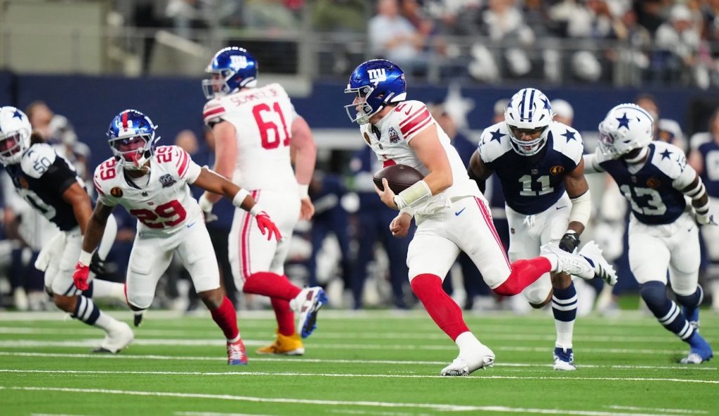 The Giants showed some signs of life late in the fourth quarter. After forcing the Cowboys to punt, Drew Lock led them on an eight-play, 80-yard drive that ended with him rushing for an 8-yard score to make it a 27-20 game with 2:18 remaining.